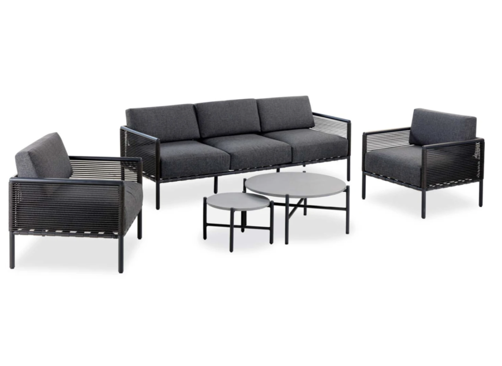 Fabricado con estructura de aluminio, sus mesas centrales en forma de nido resaltan por su tapa de 20 milímetros de cemento, aportando un toque moderno y sofisticado. Sus almohadones están cuidadosamente tapizados con tela poliéster de 260 gramos y fundas desmontables, incluye un sofá de tres cuerpos, dos butacas y dos mesas centrales.