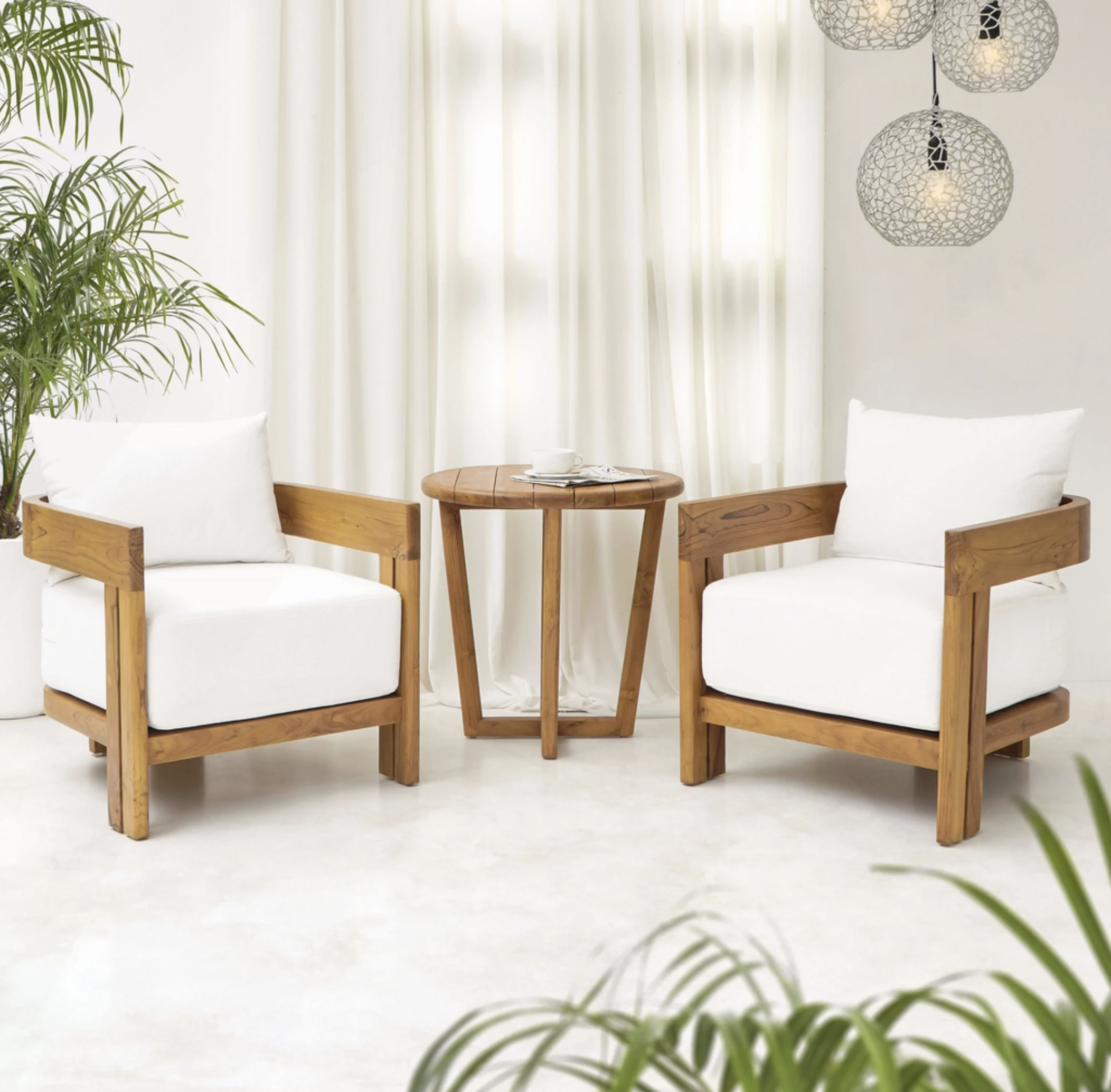Butacas y mesa lateral construidas en madera de Teca, tapizados en tela Olefin, especialmente concebida para uso en espacios exteriores.