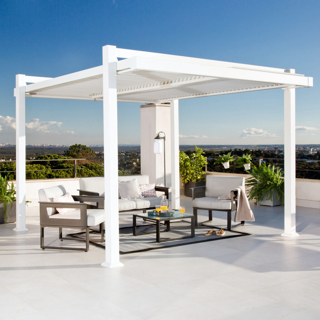 Diseñada para una instalación permanente, la Pérgola Persea te ofrece un espacio de protección ampliado durante todo el año que te permitirá colocar una mesa y sillas para 8 personas para disfrutar de una agradable comida. Además de protegerte de la lluvia y el sol, la Pérgola Persea es bioclimática: su techo rectangular está formado por lamas de aluminio impermeables que pueden orientarse con una manivela para adaptarse a tus necesidades. Puedes ajustarla para aprovechar el sol, dejar pasar un poco de aire refrescante o protegerte de la lluvia. Fabricada íntegramente en aluminio, su estructura es resistente a la humedad y al óxido. Los soportes del armazón y los pies han sido especialmente diseñados para facilitar la evacuación del agua de lluvia y evitar su estancamiento. Con su geometría, la Pérgola Persea tiene formas cuadradas y rectangulares que aportan una estética moderna a su diseño general. Para un aspecto armonioso, sus cuatro pilares cuadrados tienen tapas atornilladas. Para ofrecerte un conjunto lo más cercano posible a tu estilo, la Pérgola Persea blanca está disponible en varios colores y puede asociarse fácilmente con los muebles de jardín Odyssea.
